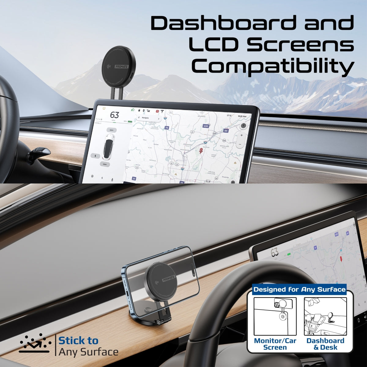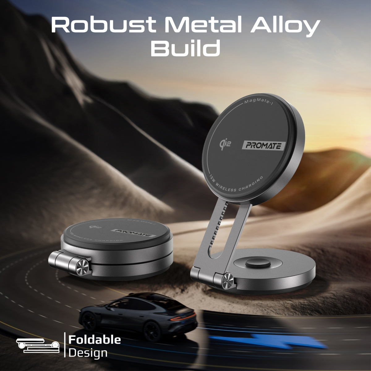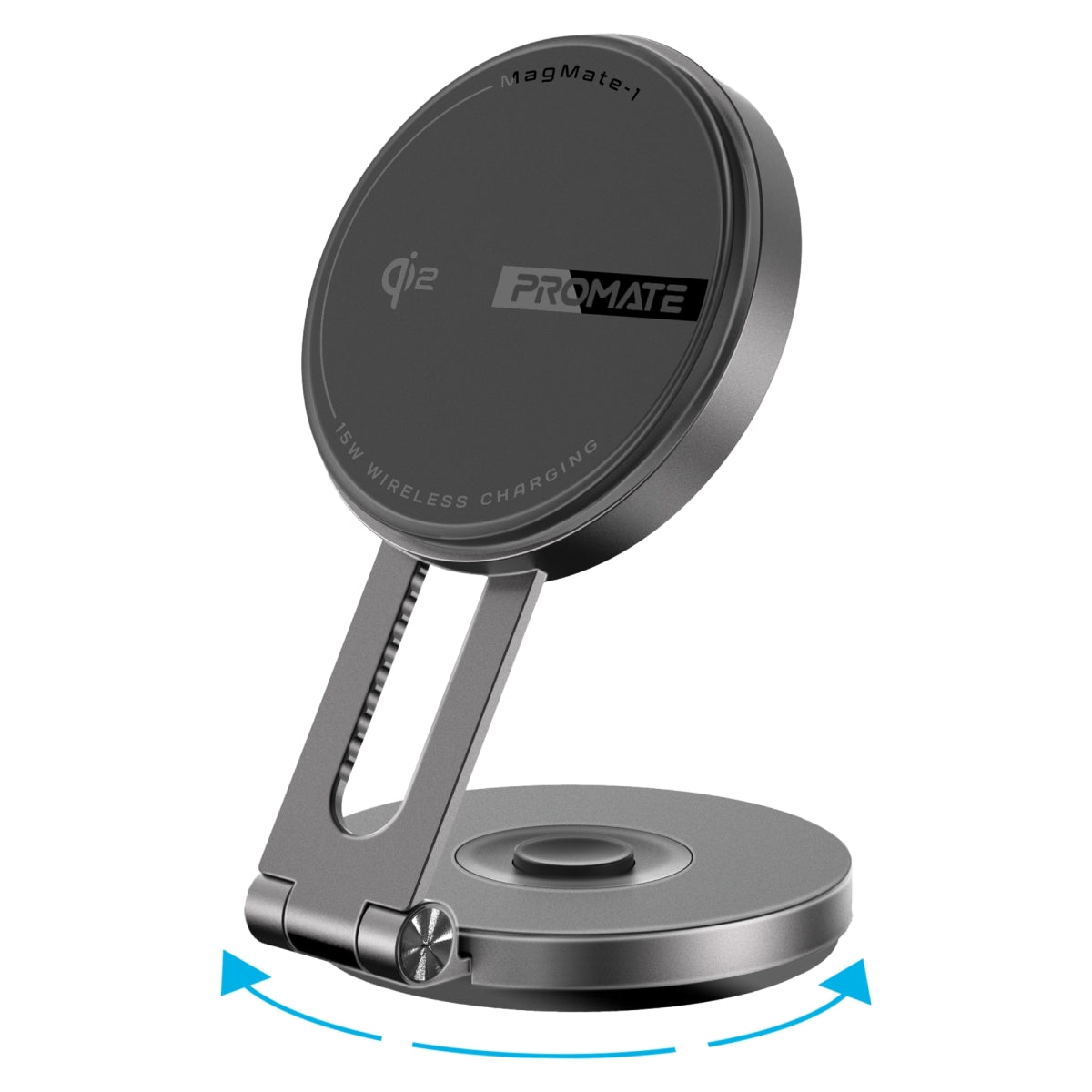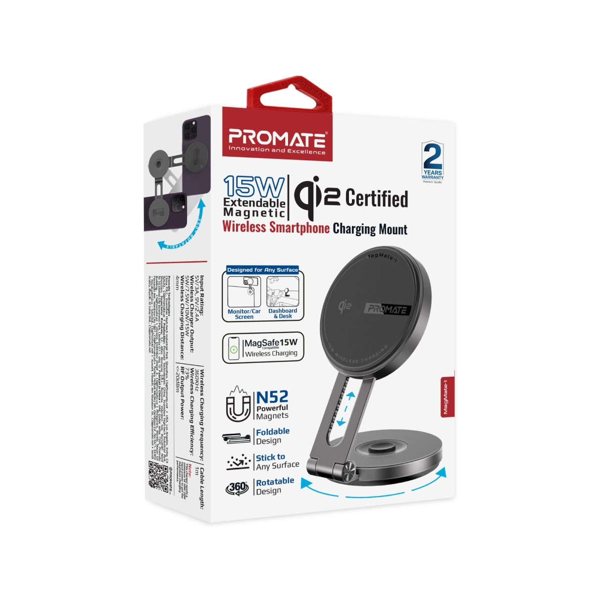 Enhance your setup with the Promate MagMate-1, where cutting-edge technology meets sophisticated design. This Qi2-certified magnetic phone charging mount provides 15W MagSafe-compatible charging while ensuring secure and precise alignment. Engineered for dashboards and LCD screens, its rotatable and extendable swing arm offers effortless adjustability and optimal viewing angles. The cradleless 360° rotatable design combines convenience with accessibility, while the durable metal alloy construction ensures reliability. Equipped with a multi-safety system and foreign object detection, the MagMate-1 prioritizes safety and efficiency. Complete with a metal ring adapter for universal compatibility, it sets a new standard for in-car charging solutions.